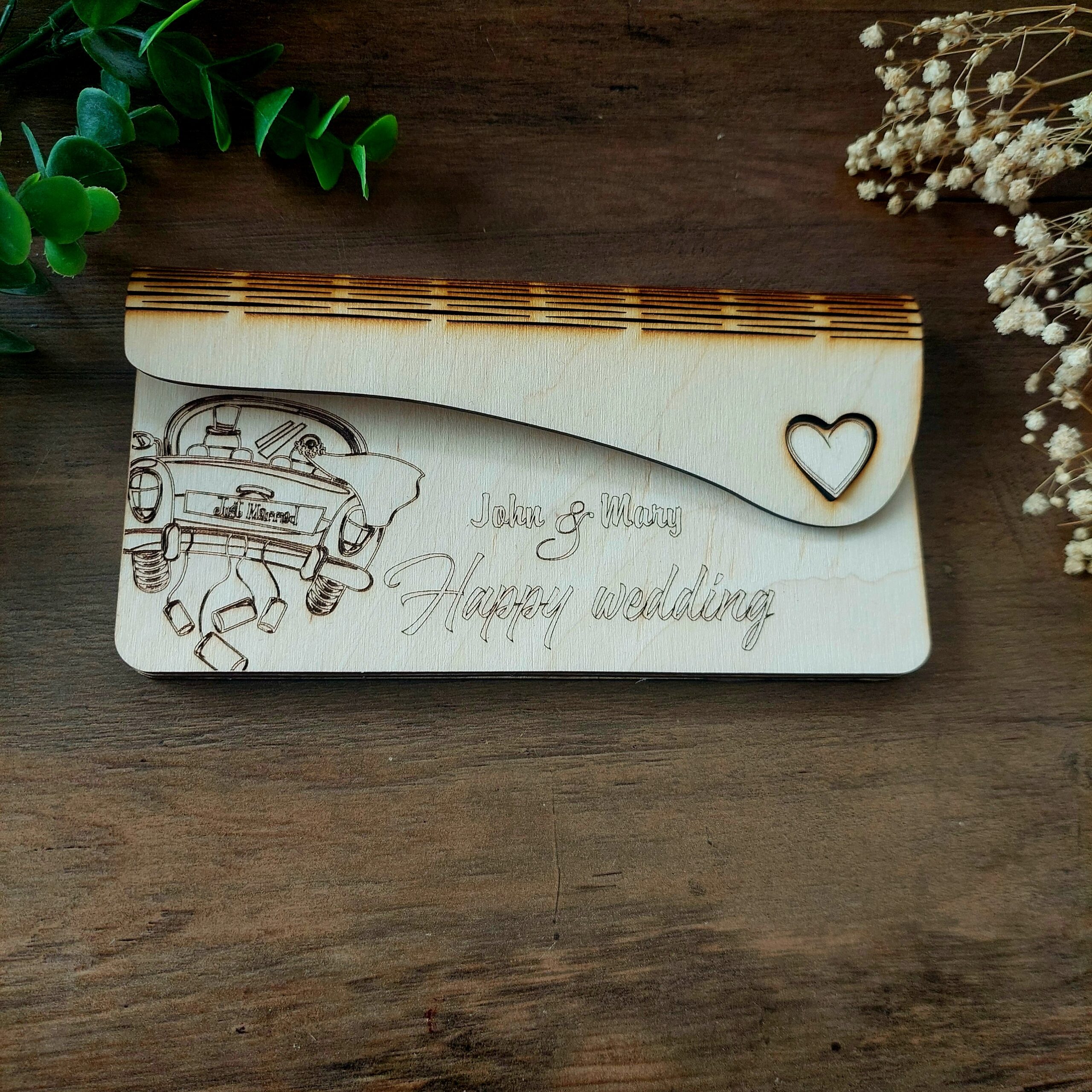 - Hochzeit: Verschenken Sie den Grundstein fรผr das Liebesnest oder die Hochzeitsreise in einem gravierten Herz aus Holz oder einem eleganten Holzkuvert mit den Namen des Brautpaares.