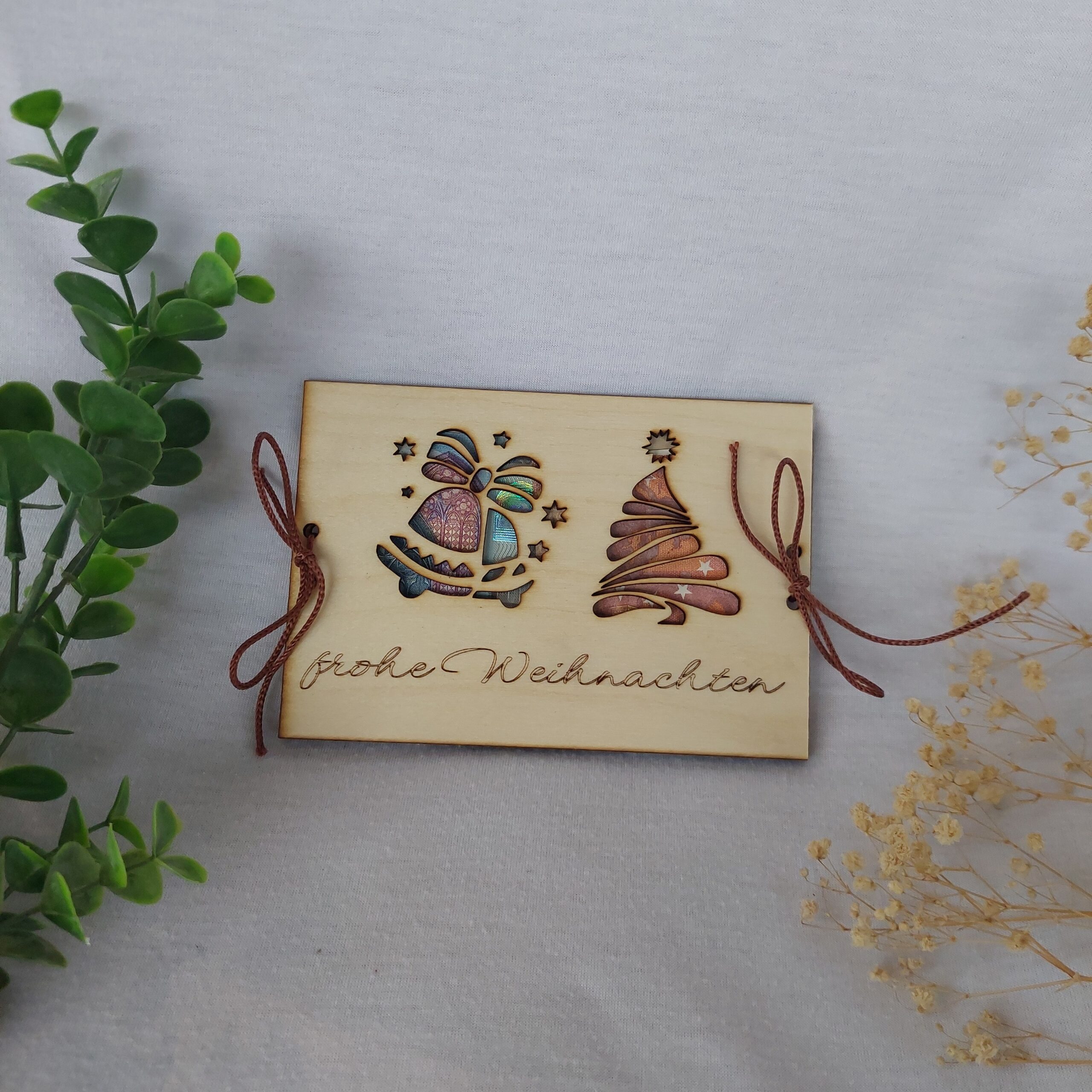 - Festliche Gravur: Die Vorderseite trägt den klassischen Schriftzug „frohe Weihnachten“. Die weihnachtlichen Motive, eine Glocke und ein stilisierter Christbaum, sind filigran ausgeschnitten und farbig hinterlegt (oder schimmern durch das Holz), was einen tollen, festlichen Effekt erzeugt.