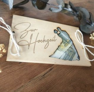 Schenke Geld zur Hochzeit auf eine stilvolle Art. Unser personalisiertes Holzgeschenk mit Gravur wird zum unvergesslichen Erinnerungsstück für das Brautpaar.