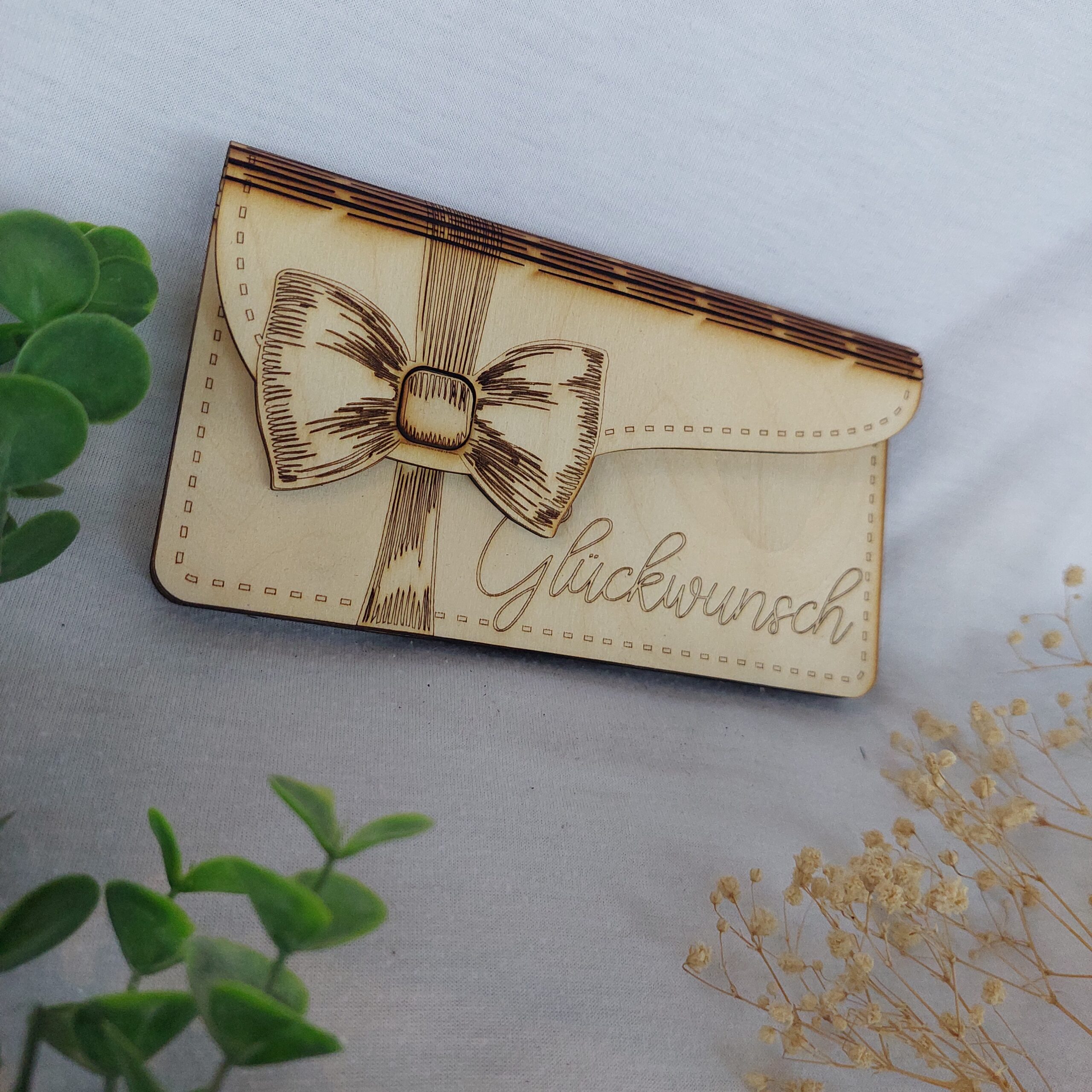 Glückwunsch-Umschlag aus Holz für Geldgeschenke. Stilvolle und nachhaltige Verpackung für Abschiede, Jubiläen oder andere Meilensteine.